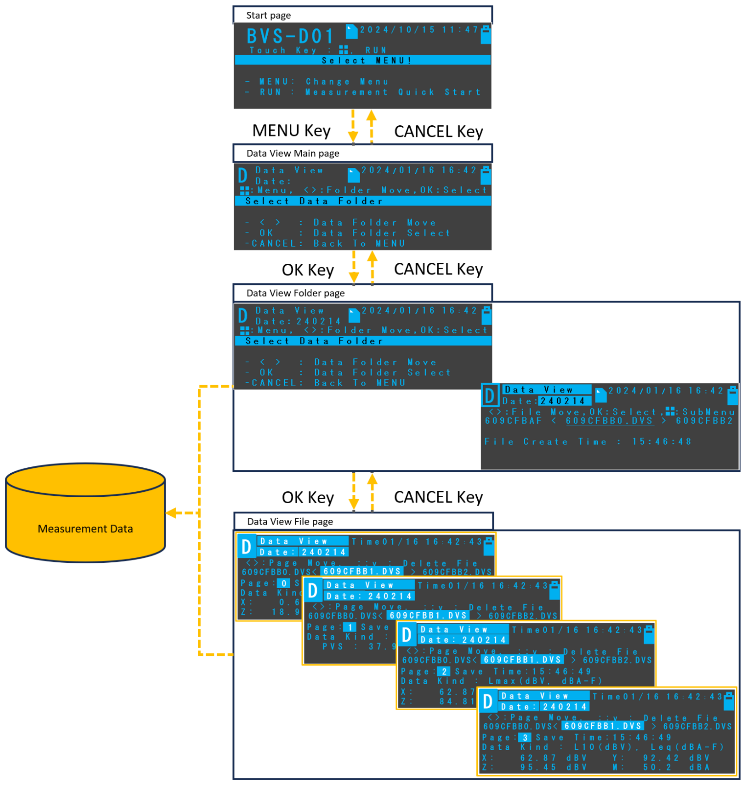 Data View Folder Page는 Data View Main Page에서 ‘<’ 또는 ‘>’ Key로 계측날짜를 선택하면 전환되는 Page로 선택한 계측날짜에 저장된 계측 file list를 아래 그림과 같이 확인할 수 있습니다.