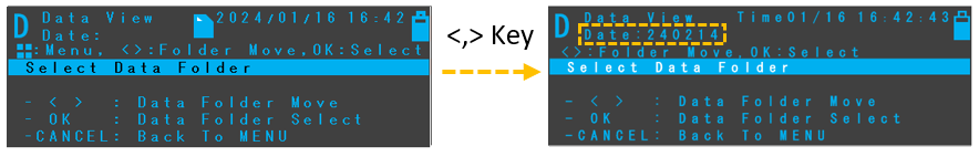 - Data View Main page에서 <,> Key touch하여 Function Line에 나타난 계측날짜 선택 후 OK Key touch하여 Folder Page로 전환