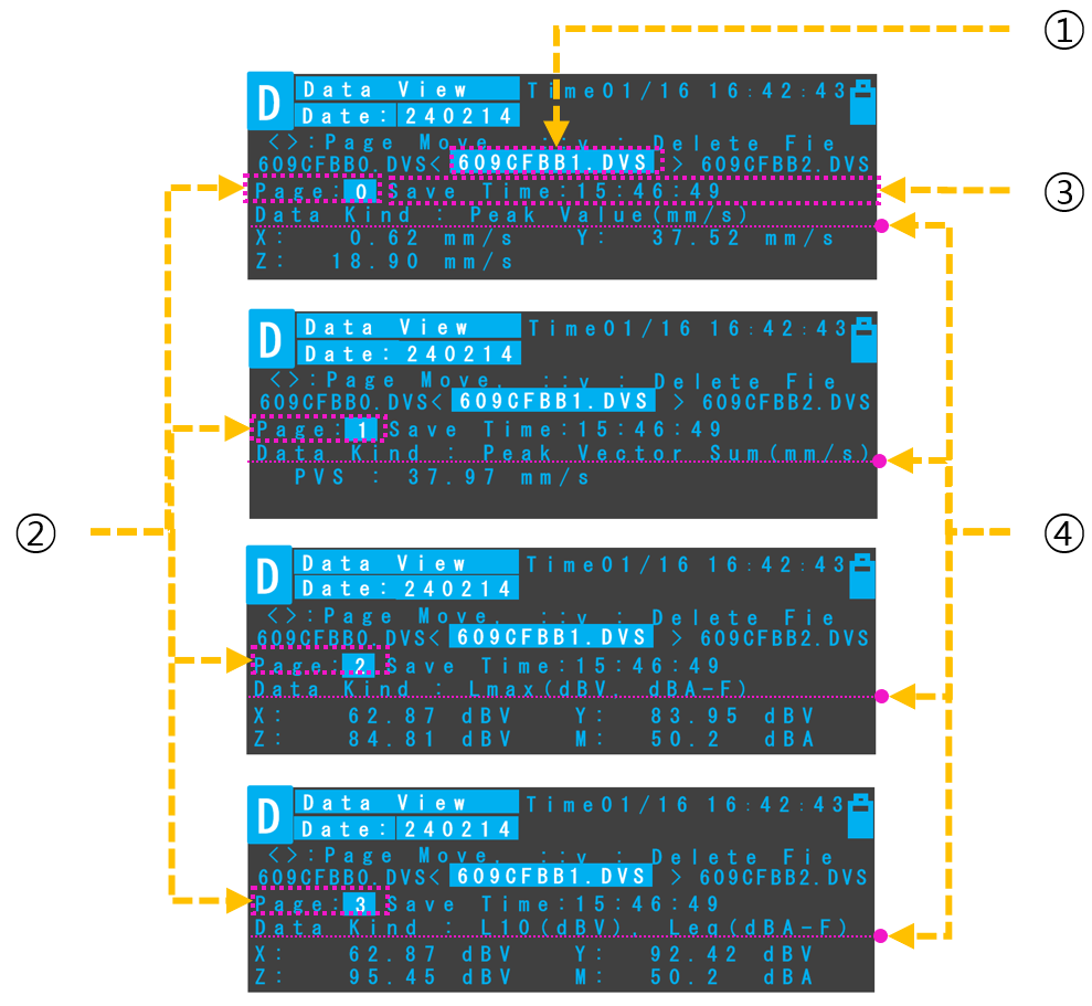 ④ | Data View File Page Data 종류 표시 Page 0 : Peak Value è Vibration-mm/s Page 1 : Peak Vector Sum è Vibration-mm/s Page 1 : Lmax è Vibration-dBV, SPL-dBA Page3 : L10(dBV) è Vibration, Leq(dBA) è SPL |