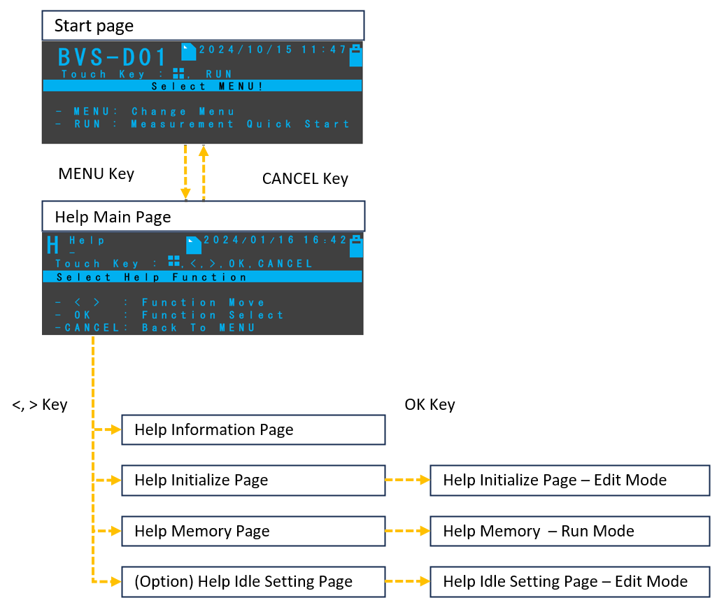 Help Menu는 계측기 정보 확인 및 조작에 필요한 부가적인 환경변수를 설정하는 Menu입니다. Help Menu의 주요 Function Page간의 관계는 아래 그림과 같습니다.