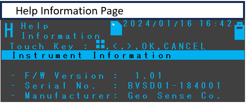 Help Menu의 Information Function Page는 계측기의 정보를 확인하는 기능으로 Firmware version및 Serial No. 등을 확인할 수 있습니다.