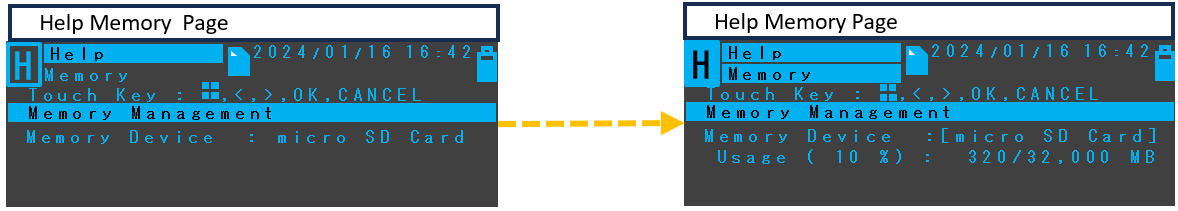 Help Menu의 Memory Function Page는 계측 시 저장되는 Memory 관리하는 기능으로 메모리 사용정보 확인 및 Memory device format 기능이 있습니다.