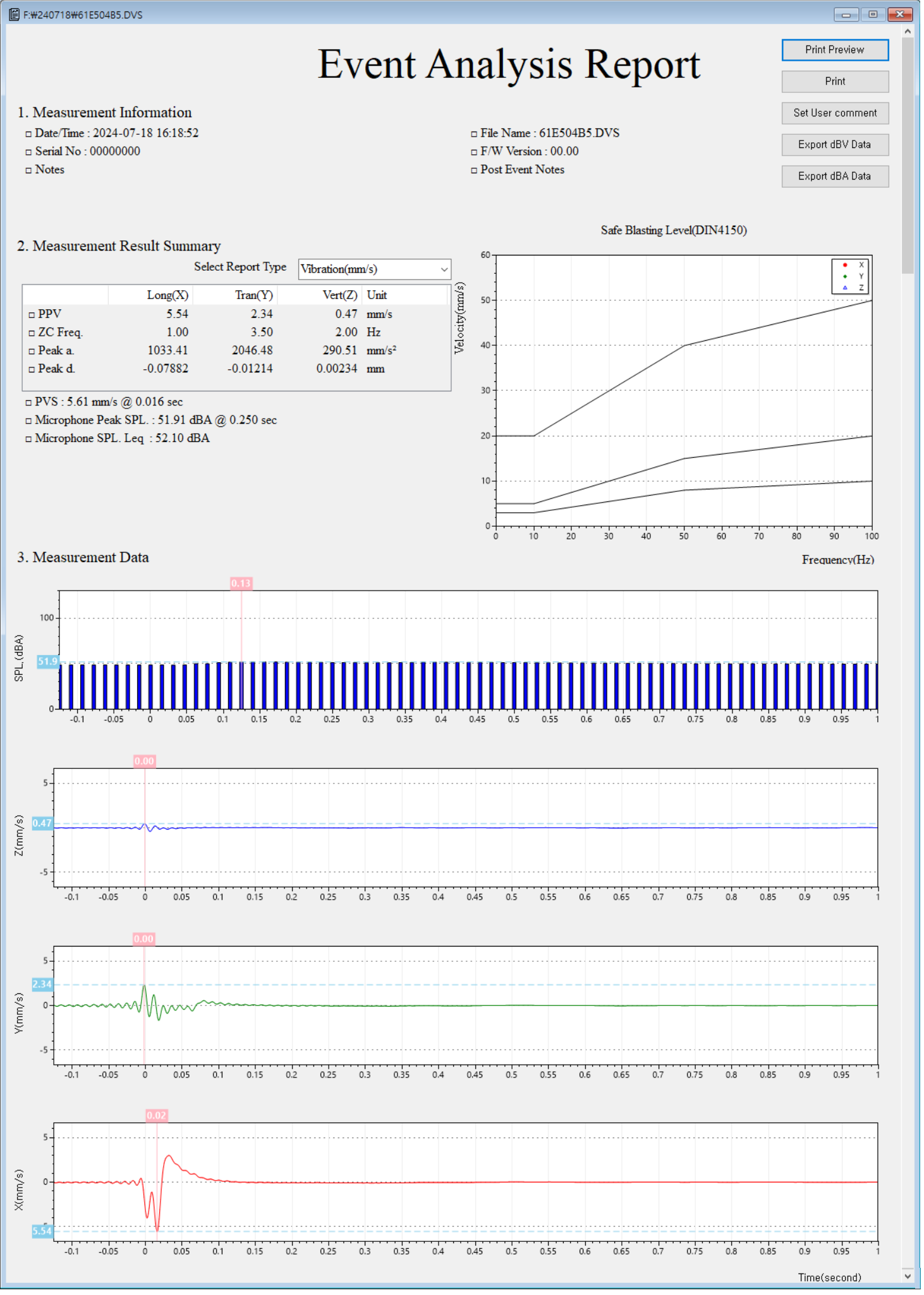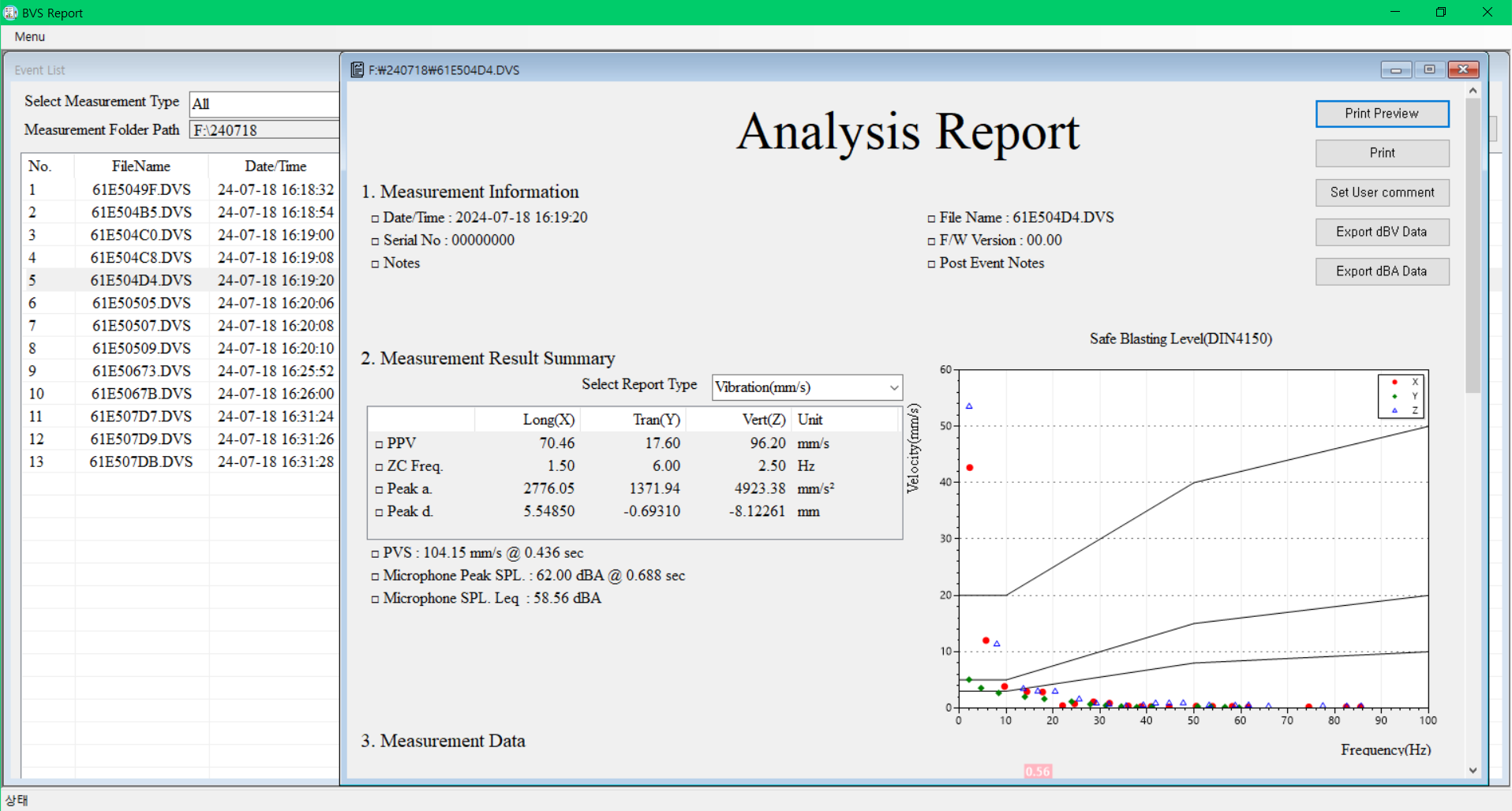 BVS Report는 Main Module에서 저장한 계측 파일을 확인하고 보고서 형태로 출력하는 MS Windows 10/11용 application software입니다. BVS Report는 아래 그림과 같이 Event List와 Analysis Report화면으로 구성되어 있습니다.