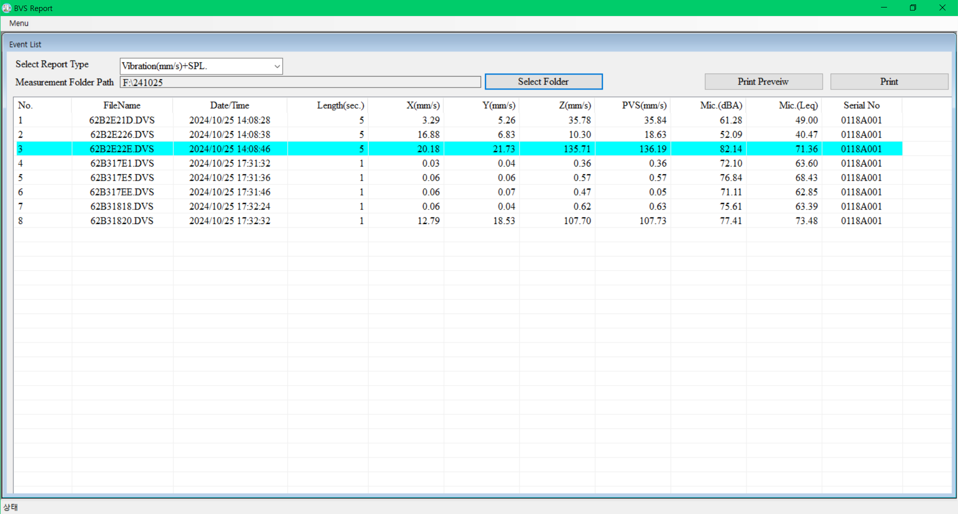 - Vibration(mm/s) + SPL.: Measurement Folder Path에 저장된 계측파일 중 Vibration(mm/s) 또는 SPL.을 표시할 수 있는 file의 계측 결과를 Event List에 출력